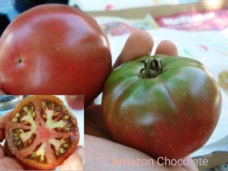 A brown tomato salad type, but you might mistake it for a beefstake before cutting it open, as it is very big. Flesh is softish and aromatic. Delicious and rare. The only problem is that it's prone to cracking after rain after a dry spell, so best grown in a greenhouse or watered regularly but sparingly. Originated in the Amish community.