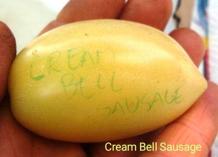 Sausage shaped salad tomato. Pale creamy yellowish color, described also as ivory, the lightest of the sausage shaped varieties we grow. Determinate growth.
