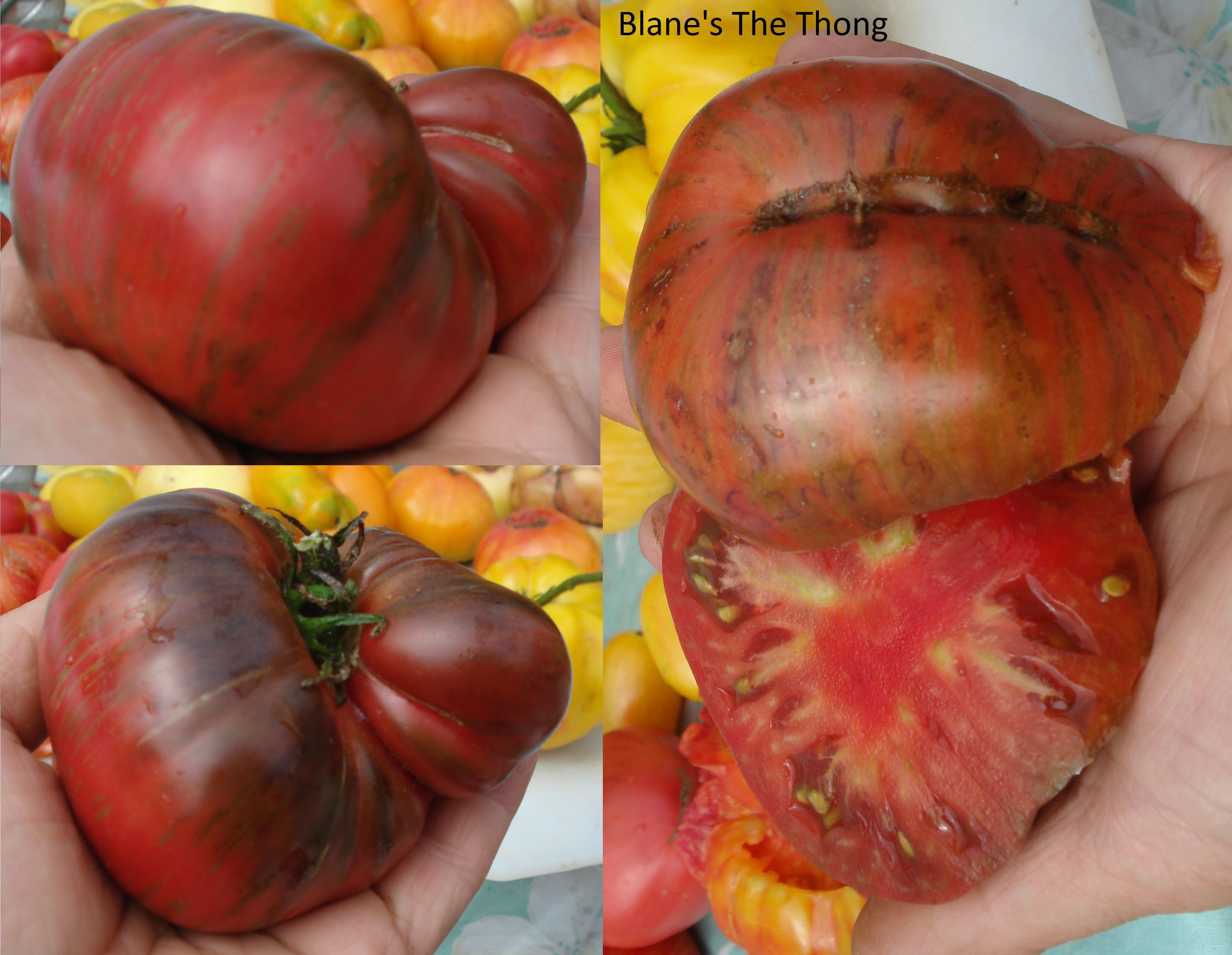 Gold and green stripes on a brownish red background. Beefsteak type. Determinate, grows ca 1 m tall, great for growing on balconies or other places where small size is required.