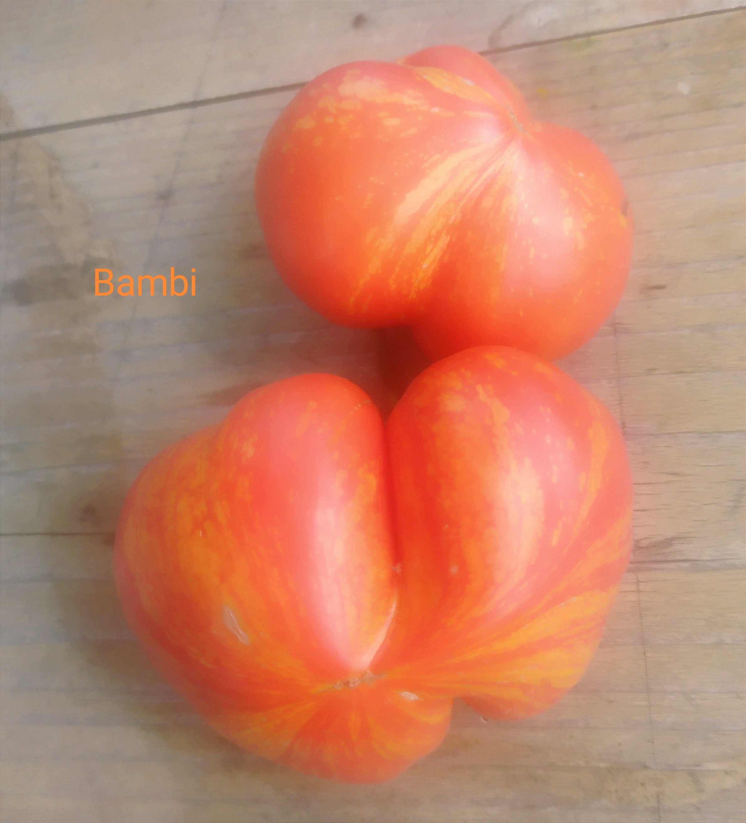 One of our selectons. A cone shaped salad type, red with orange stripes. Named with a friend's nickname.
