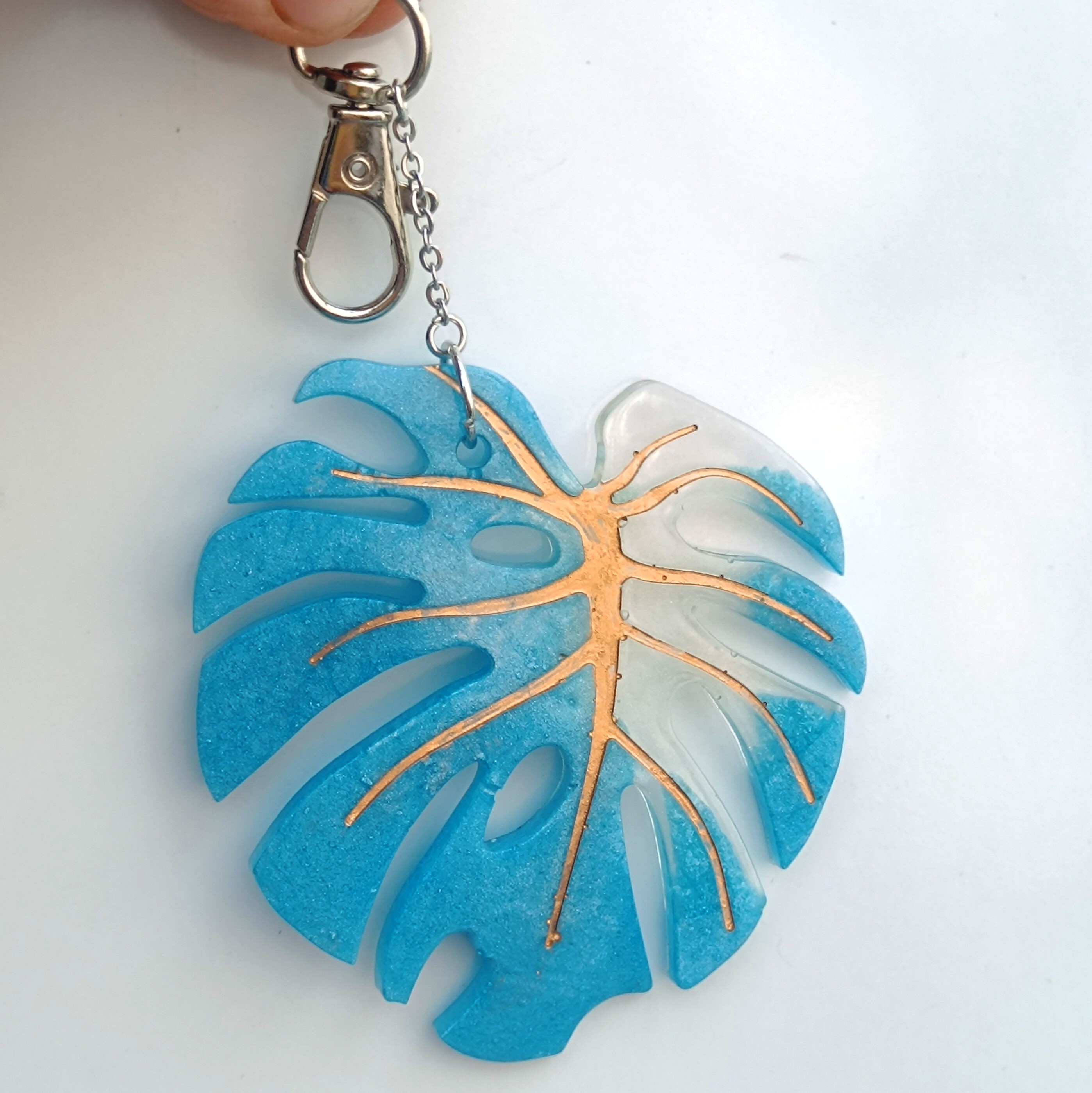 Blue & pearl monstera leaf keychain, epoxy + gold paint