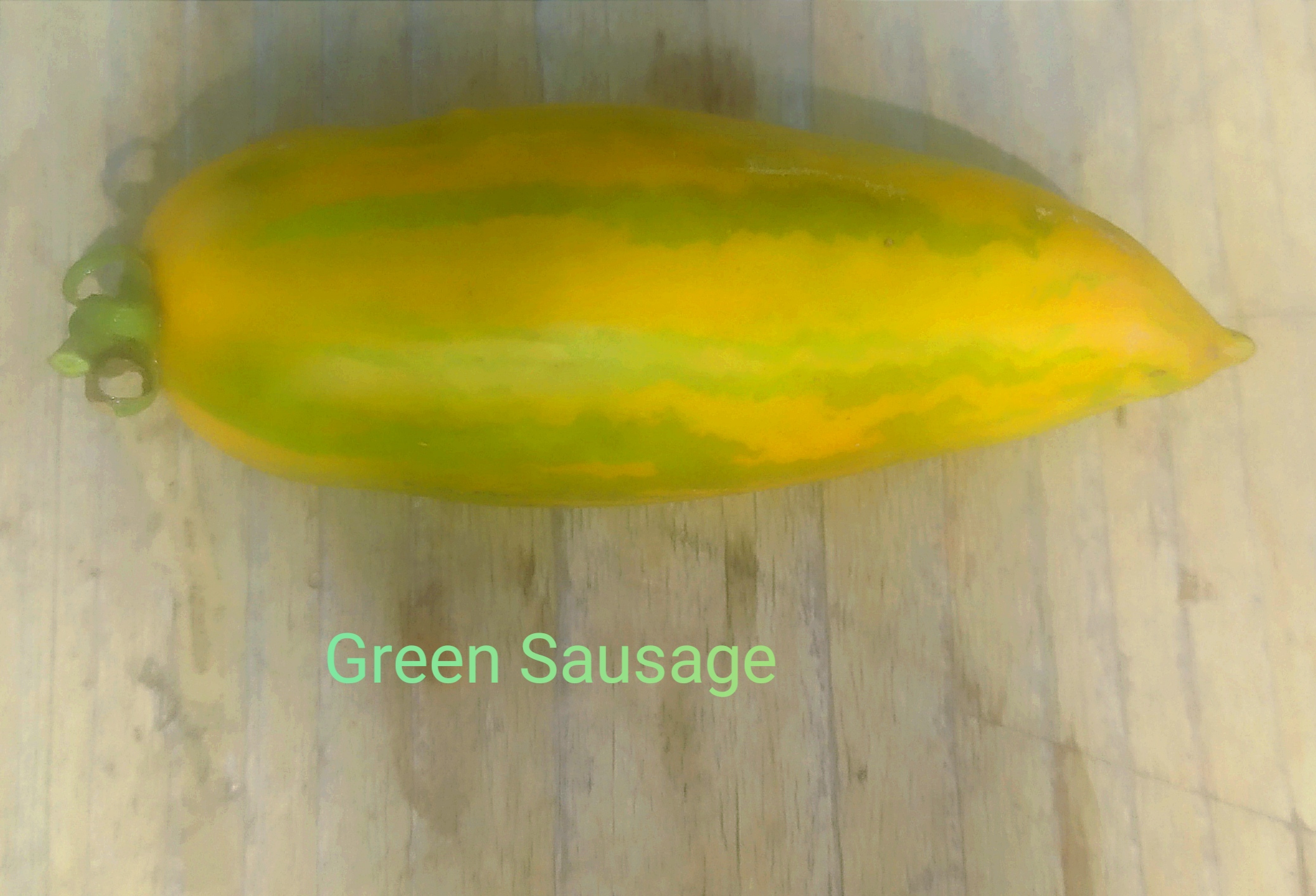 Sausage shaped. Green striped. Watch the streaks: when they turn orange, the tomato is ripe. Excellent salad variety. Determined growth, quite a short plant, but full or tomatoes.
