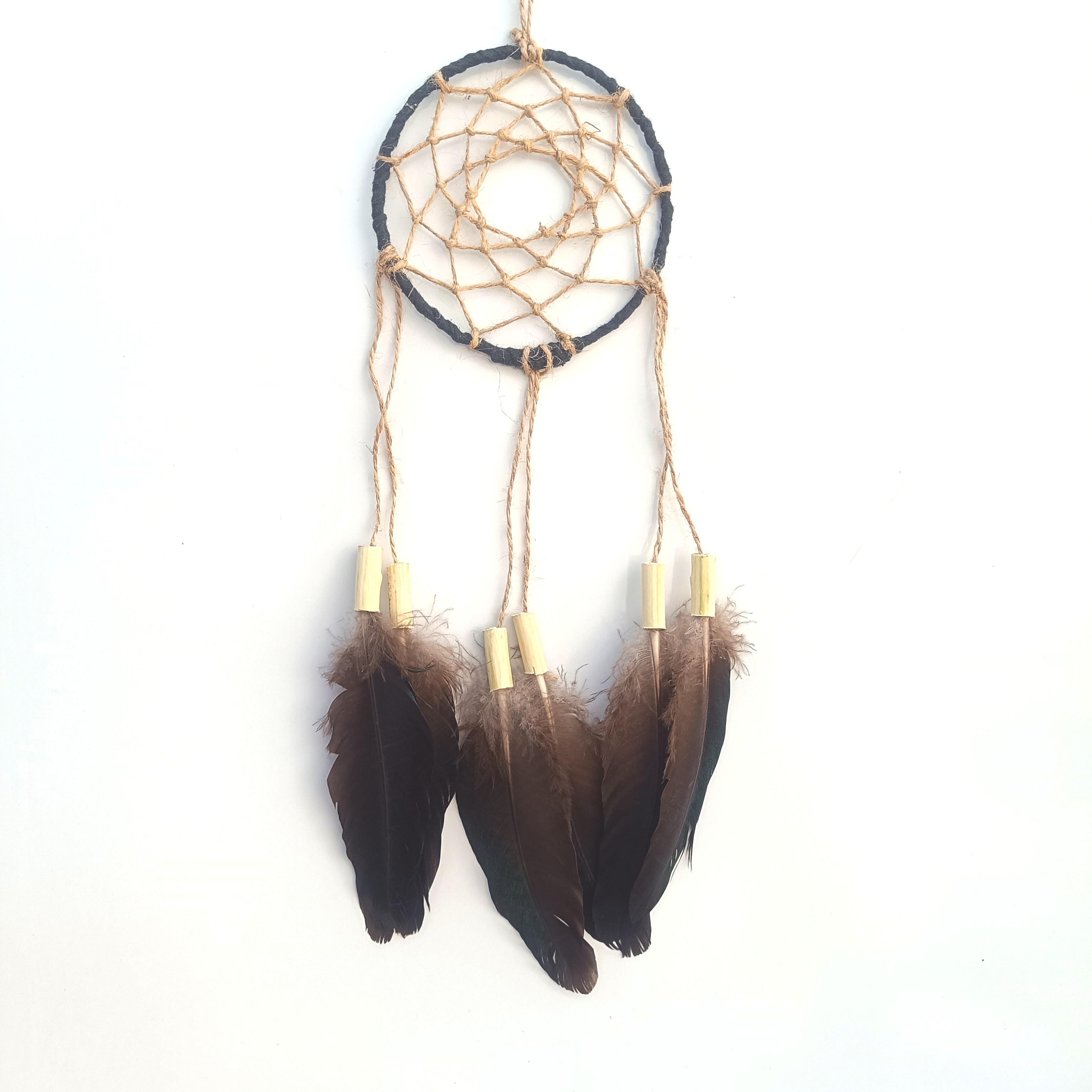 Dreamcatcher handmade out of natural and up-cycled materials with very special peacock feathers. These are black with a metallic blue sheen. Feathers are 100% ethical, they are naturally shed by my pet birds. I carefully find symmetrical feathers for each item I make. If you visit or stay at our camping farm you can see all the birds whose feathers I use to make dreamcatchers and jewellery.