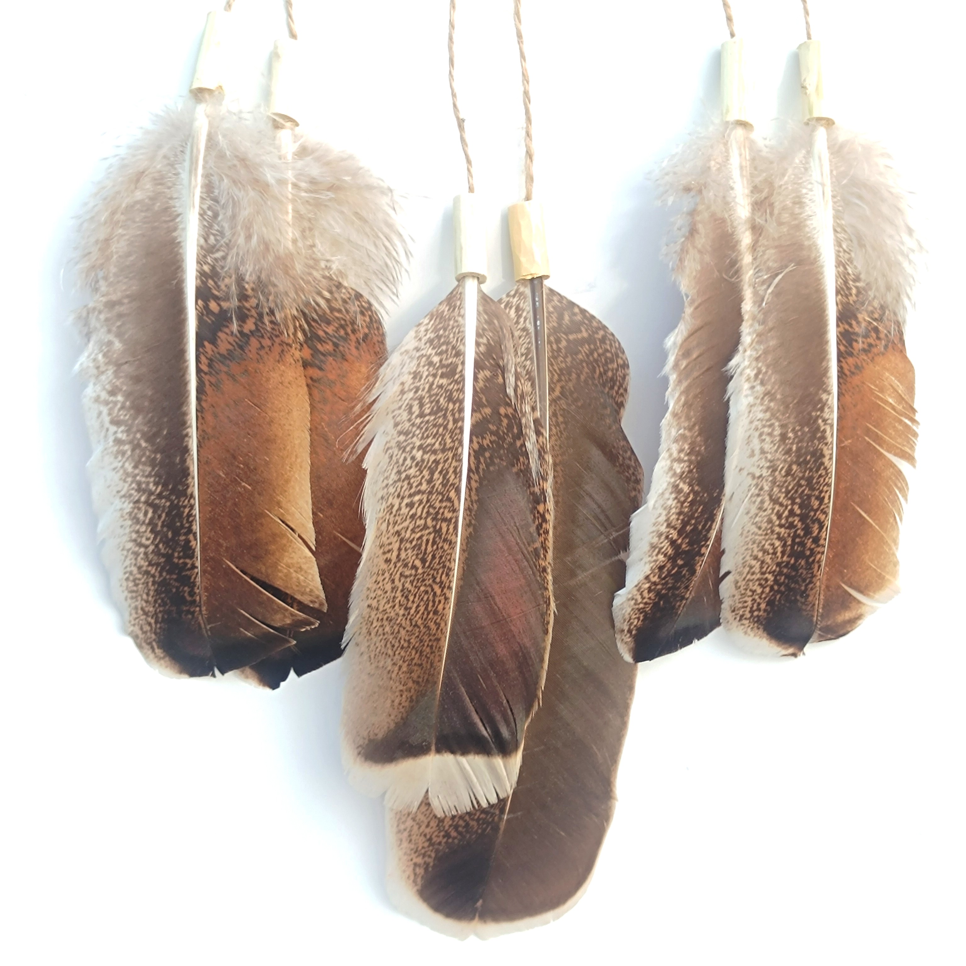 Dreamcatcher handmade out of natural and up-cycled materials with turkey wing feathers. Feathers are 100% ethical, they are naturally shed by my pet birds. I carefully find symmetrical feathers for each item I make. If you visit or stay at our camping farm you can see all the birds whose feathers I use to make dreamcatchers and jewellery.