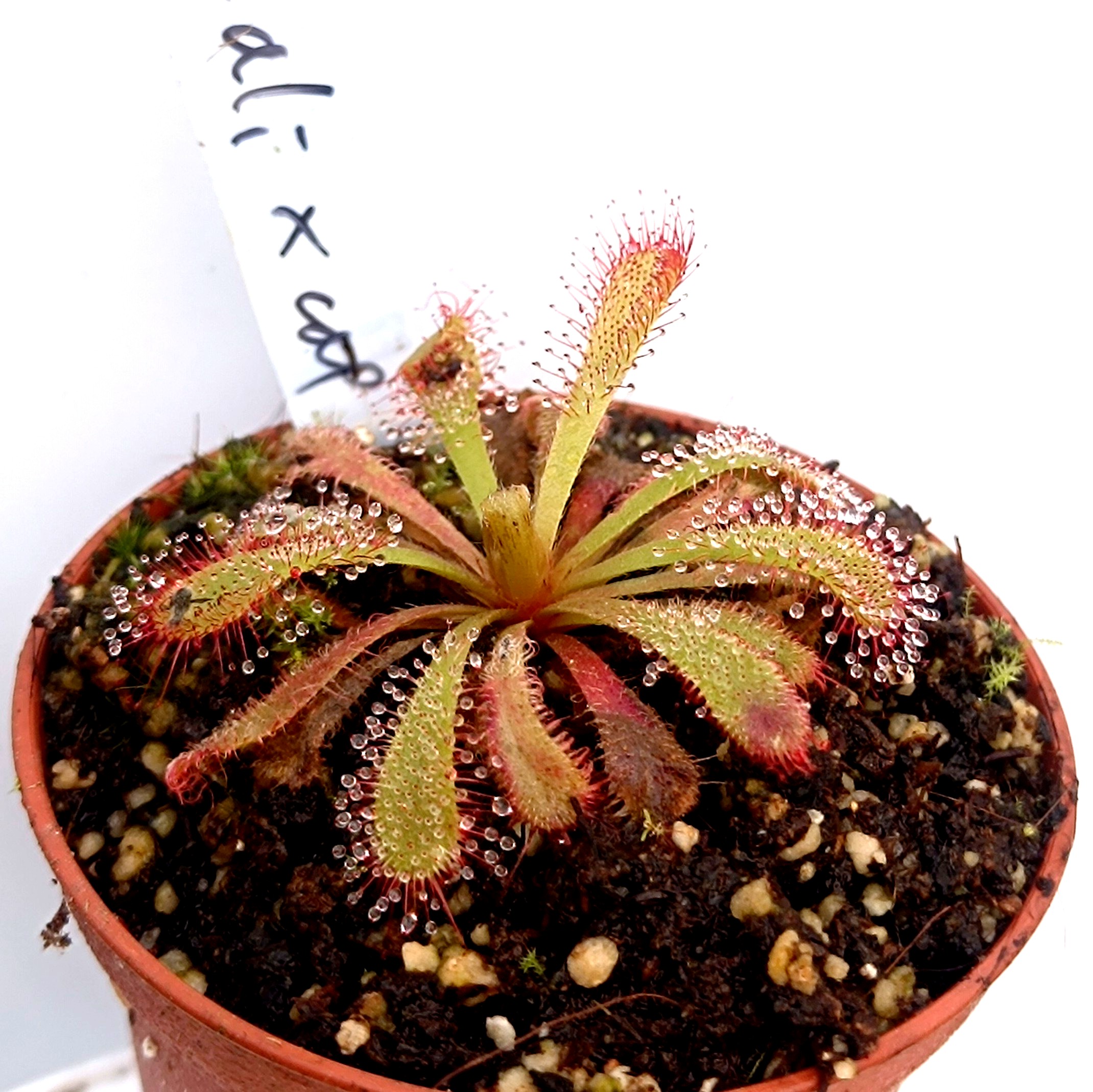 Drosera aliciae Giant rosette x capensis Large form, Dr. Eberhard König, cl. 2 is a rare hybrid of two rare-ish clones of common plants. Both parents of this hybrid are very large plants, compared to the typical sizes of their respective species. This means Drosera aliciae x capensis grow into an unusually large plant as well. It is a curious plant, somehow familiar and yet somehow ''off''. And the best part? It's very easy to grow!