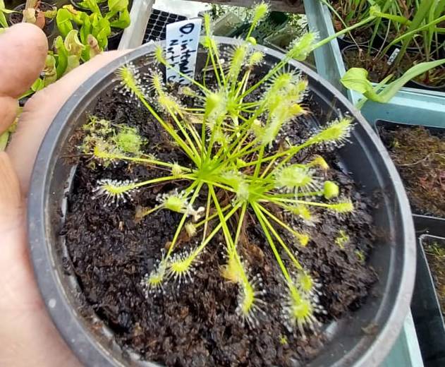 Drosera intermedia ALL GREEN, North Carolina is an anthocyanin free (all green) form of the species from North America.