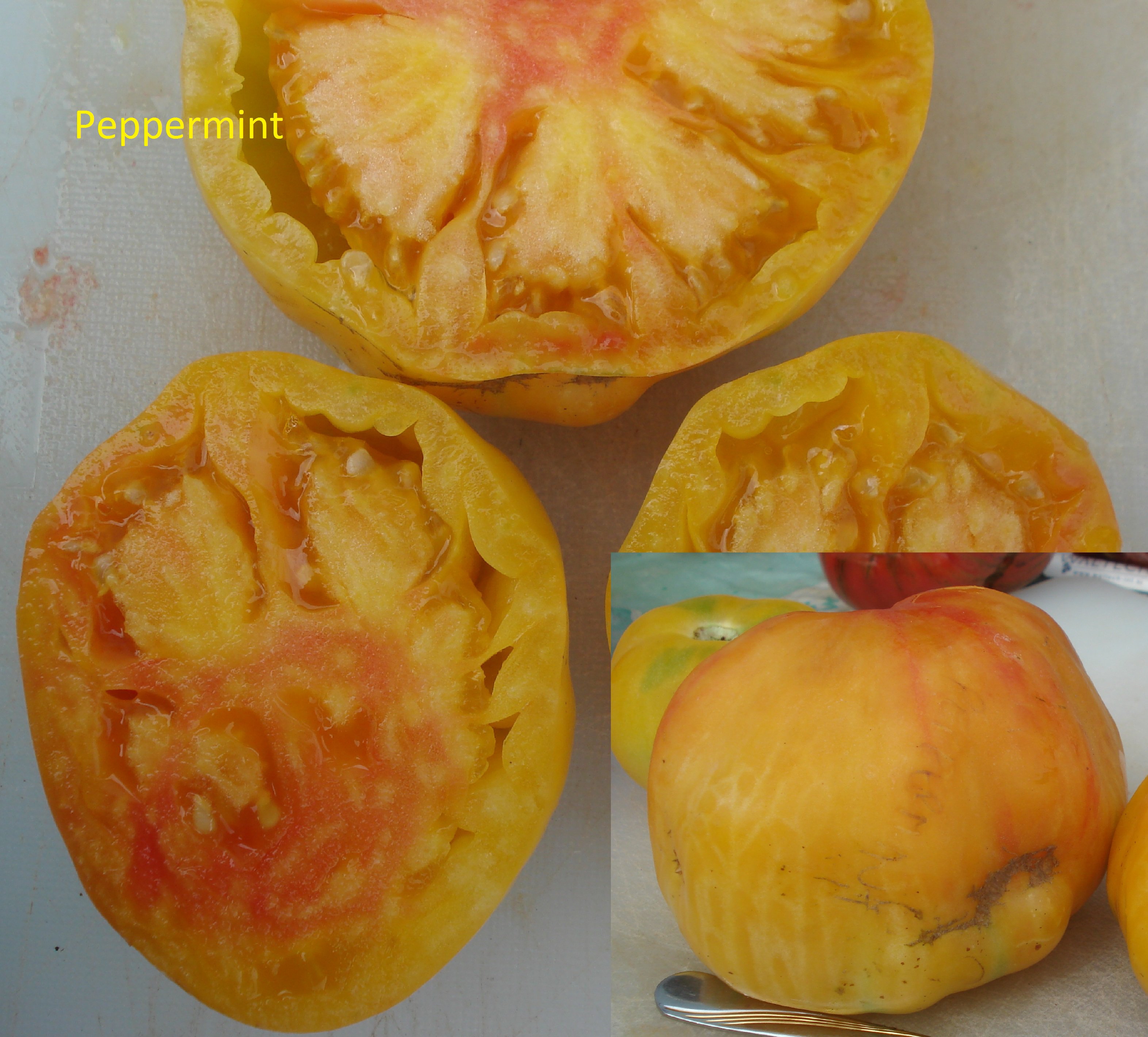 Bicolored soft beefstake. Orange, red and yellow streaks that continue into the flesh. Very sweet taste.