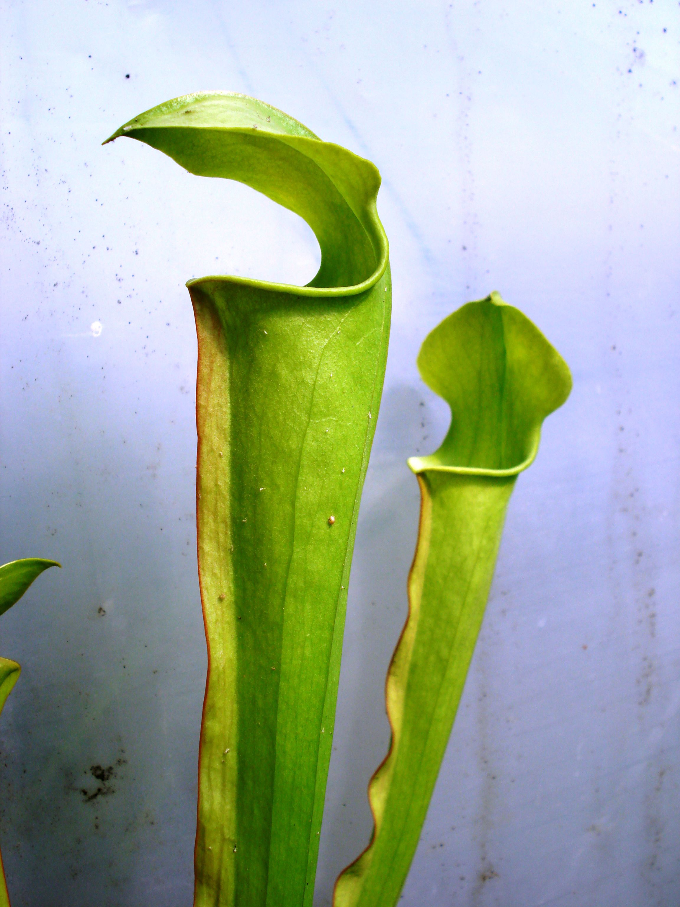 Sarracenia alata var. alata A1 MK has tall and narrow green pitchers, that have a bit of acoppery hue on the top of the lid.