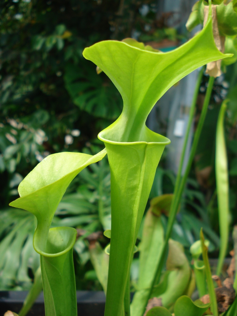Sarracenia flava var. maxima DIVERSIFLORA GREEN is a striking plant. The pitchers are all green, yellowish green on the operculum, without any trace of red or venation. But it is not an antho free plant! There is red at the base of the leaves. Flowers are yellow as is typical of the species.
