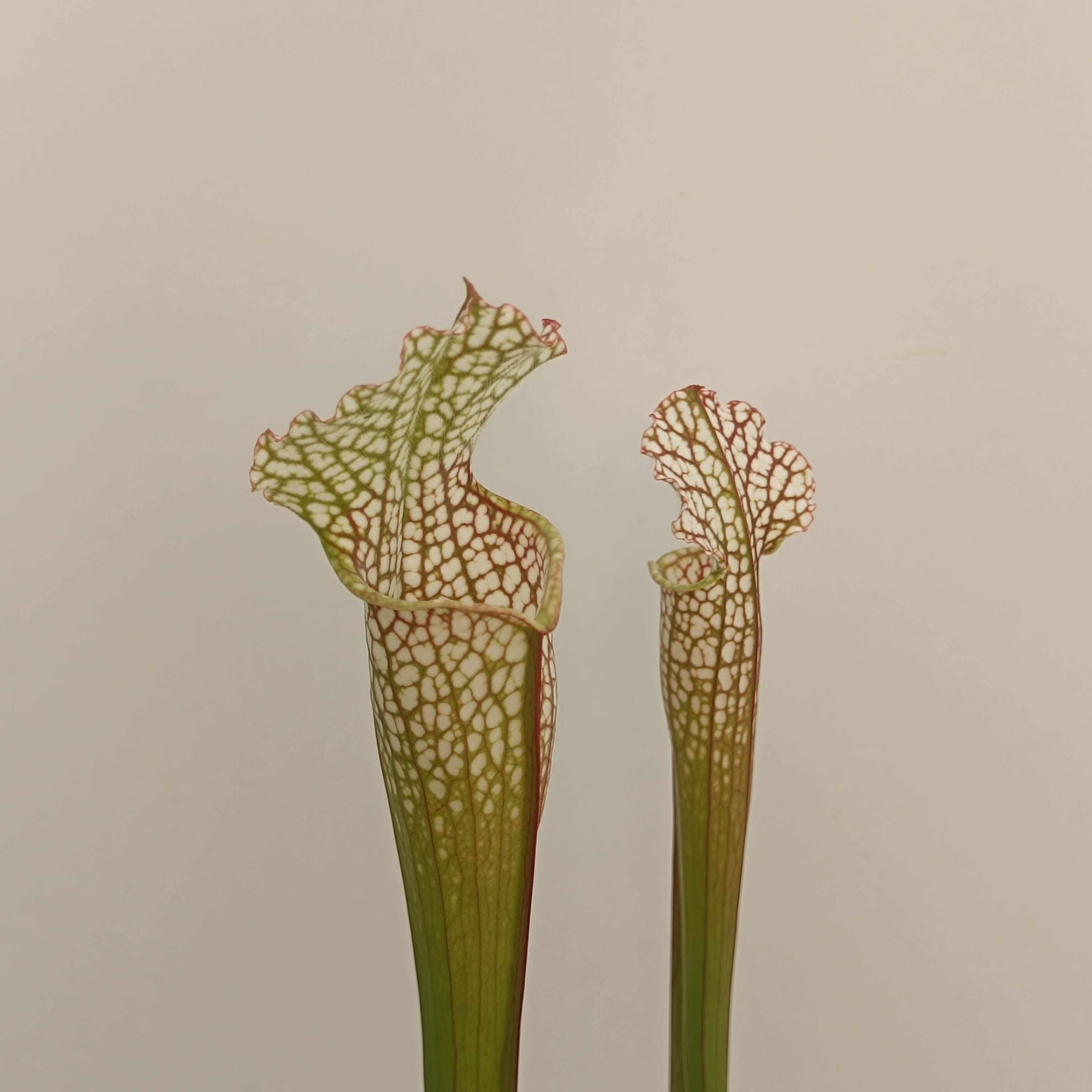 Sarraceni leucophylla L18 MS is a tall, vigorous clone from Mirek Srba. Like all sarracenias, leucophylla is native to North America. The species is endemic to the Southeastern United States. Sarracenia leucophylla is naturally highly variable. In size the clones can vary between 30 cm to over 1 m. Plants can be red+white or white with green veins or just white. Both of the latter may be antho-free or not. Venation may be more or less pronounced and fenestrations bigger or smaller. Clones with pinkish or reddish tops are showing introgression of S. rubra or even S. alata genes and plants with a dark throat patch may have S. flava genes. In the hobby leuco clones are very popular as parent plants for producing innumerable hybrids.