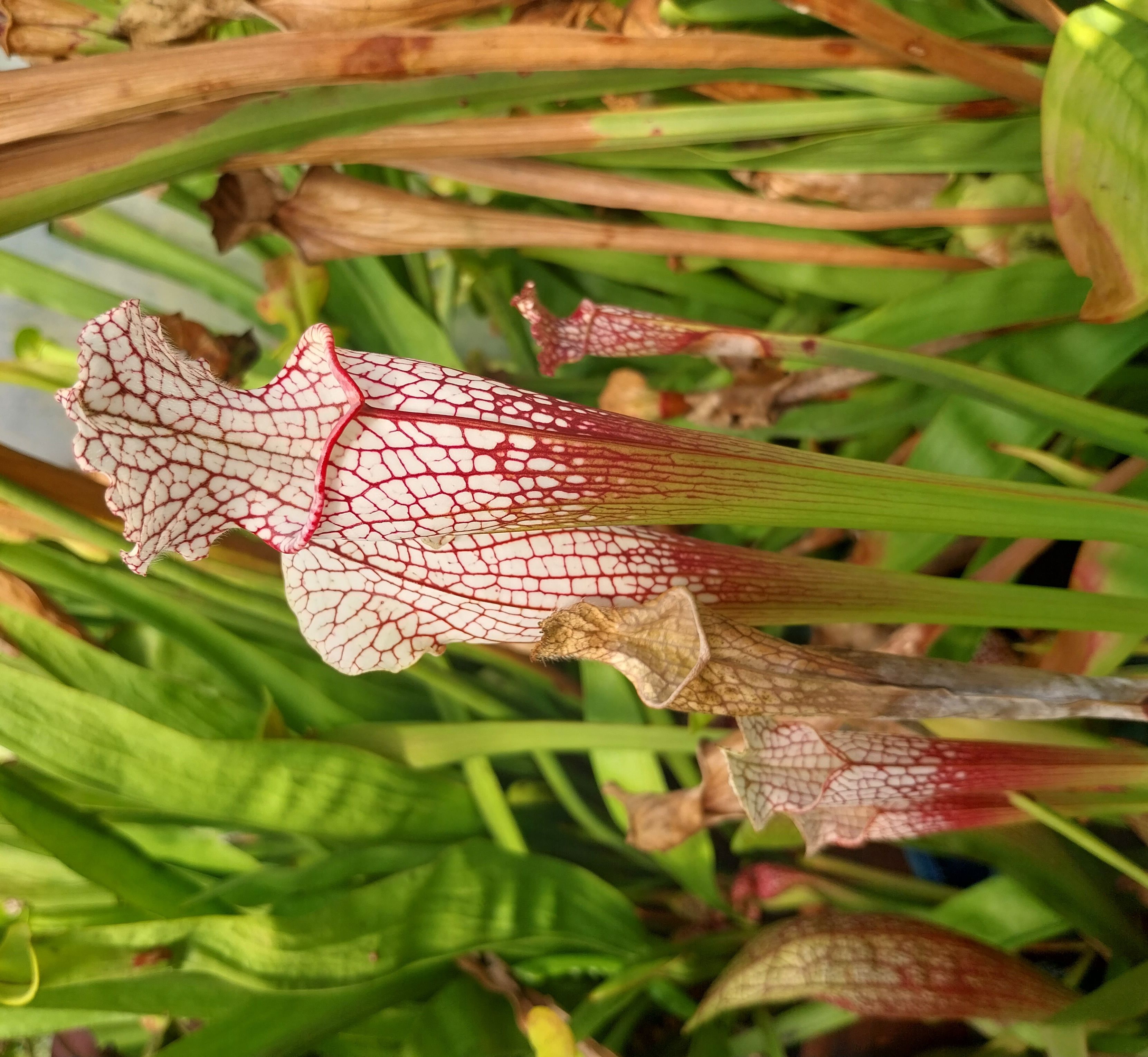 ''The plant (L4 MS) is characterized by a relatively small cap, which is almost as wide as the stems, and also by a relatively thick red veining, which was a valued feature among plants grown at the time (1990ies). However, in the context of the current assortment of red-veined and all-red (probably hybrid) S. leucophylla plants, the L4 clone designation is somewhat misleading. In retrospect, however, a hypothesis is offered as to how the plant presented here came to be labeled "Red Tube". The plant, in a number of morphological details, is very similar to plants from the Alabama location of Splinter Hill. Hybrid, all-red plants are occasionally found within this population, which are often referred to as S. leucophylla "Red Tube". It can therefore be imagined that, the first growers eagerly obtained seeds from this location under the name "Red Tube". However, the seeds produced plants with a typical appearance, and since no reference literature was available at the time, plants of standard coloration were further propagated under this designation.''