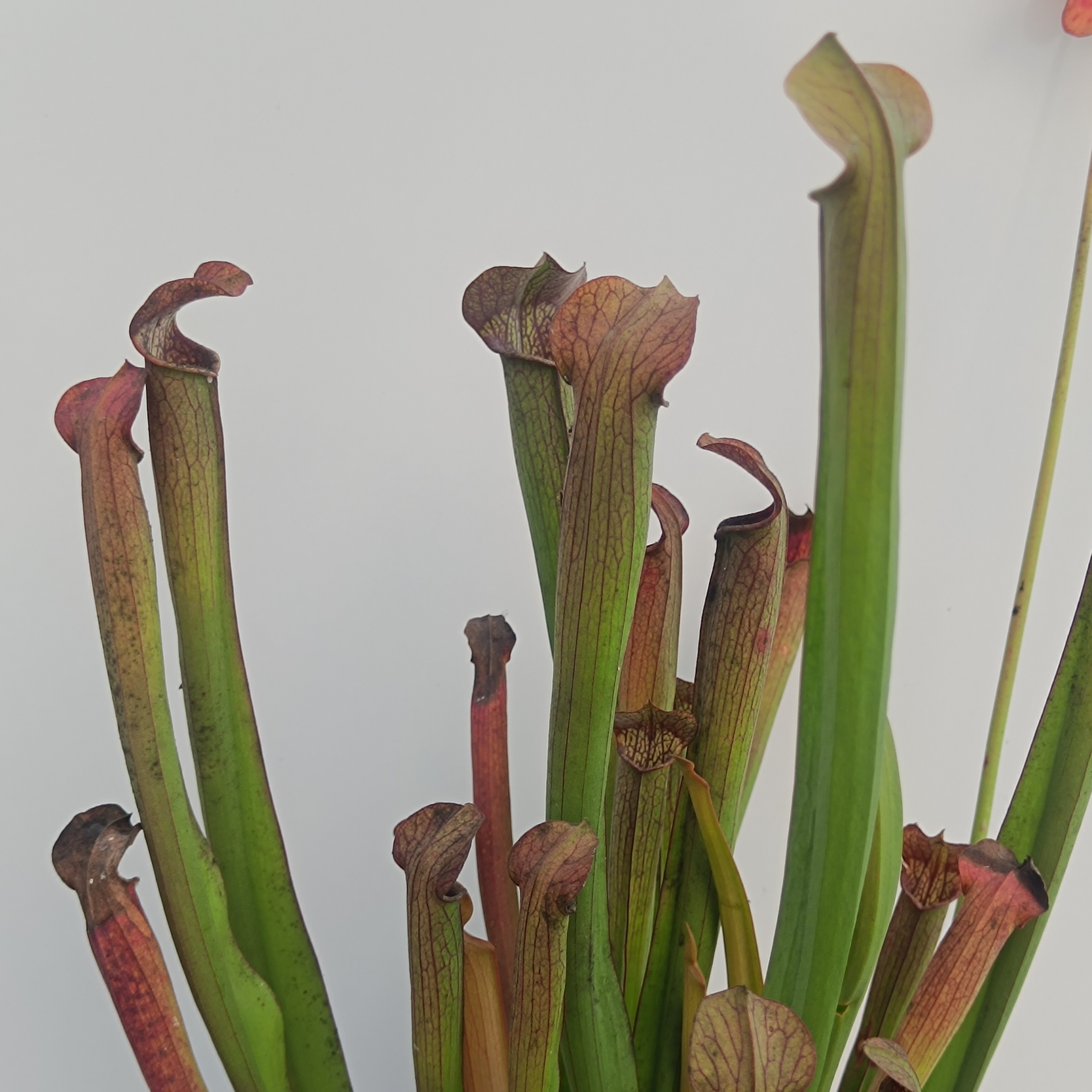Sarracenia rubra subsp. rubra is the smallest rubra subspecies. Rather compact dark green plant with strong red hue on the tops of its pitchers and pinstriped veining. Fast grower, will form a nice big clump faster than most other sarracenias. Pitchers are slender but compact, only 26-45 cm tall, and last well into the winter. I have read the comment that the pitchers look like standing meerkats - and yes, I can definately see this, can you? In all, a very cute plant. It has a distinct flower: small, with a distinct sweet raspberry smell and dark red petals that have a notch on their distal edges.