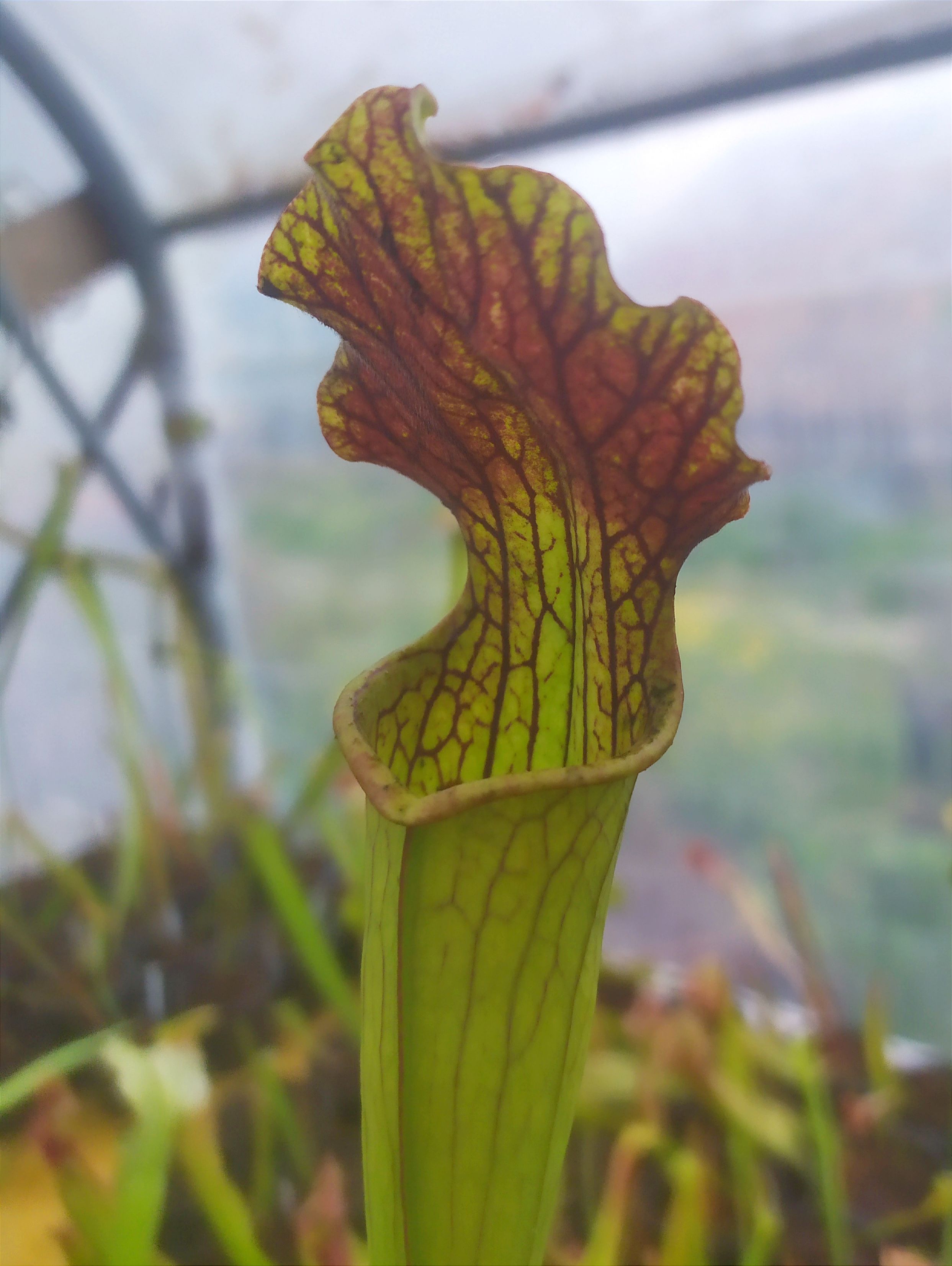 Sarracenia x areolata 'DIVERSIFLORA RED' is natural hybrid, a plant with known location but with open polinated parentage. The plants in our collection are grown from seeds originally collected in the wild on the Alabama - Missisipi border. We acquired them as a mix of seedlings and three of them grew to maturity. This clone is very vigorous and grows taller than both of it's parent species. It's one of the tallest sarras in our collection.