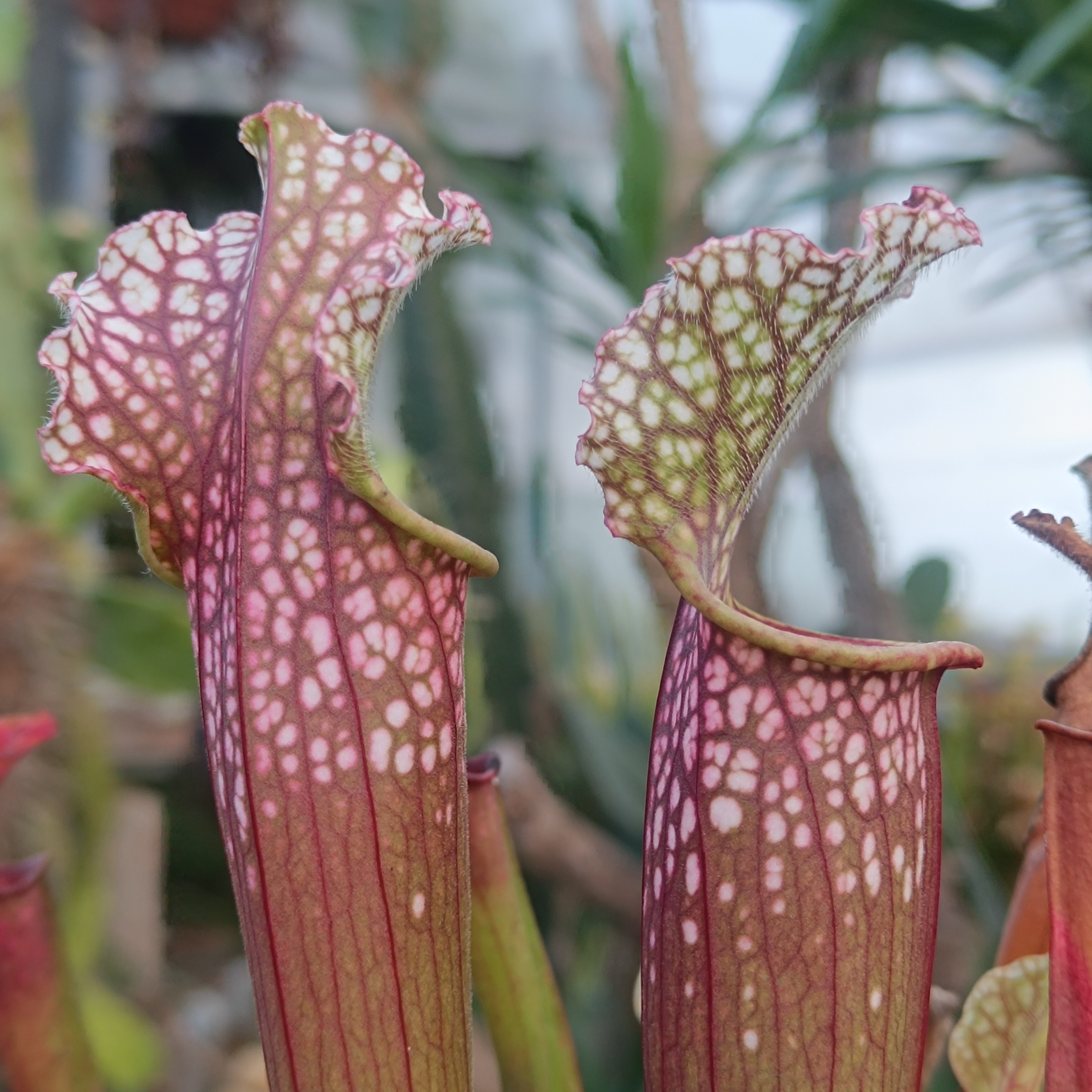Sarracenia x stevensii Boobie Jo is a hybrid Sarracenia rubra subsp. gulfensis x leucophylla. We obtained is under the name Boobie Jo, yes, Boobie, not Bobbie. We know it was bred in UK in 2019, but not much more than this. Despite having a slightly scant provenance, the plant is really pretty. It grows to 40ish cm tall. Pitchers on young plants are intensely pink and small. Only on adult plants do pitchers reveal their true beauty: rich red background, dotted with a lace of fenestrations and a very wavy lid.
