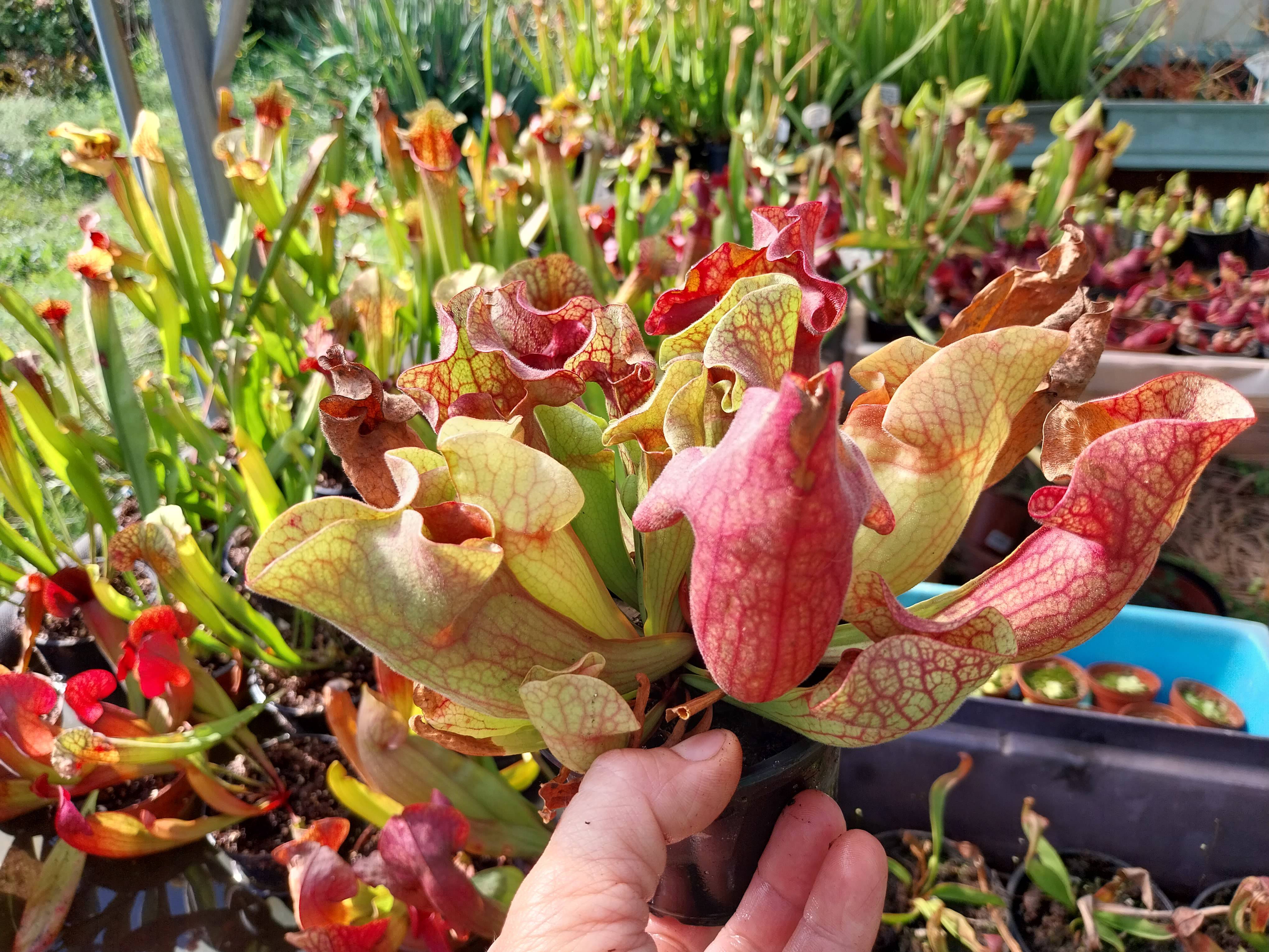 Sarracenia x purpurea 'EVELINA' looks like a large rose flower. Large pitcher lids are ruffled, the many pitchers are short. Gentle greens, reds and pinks mix on and among the pitchers. Pitchers persist long into the winter. Truly a very decorative plant.