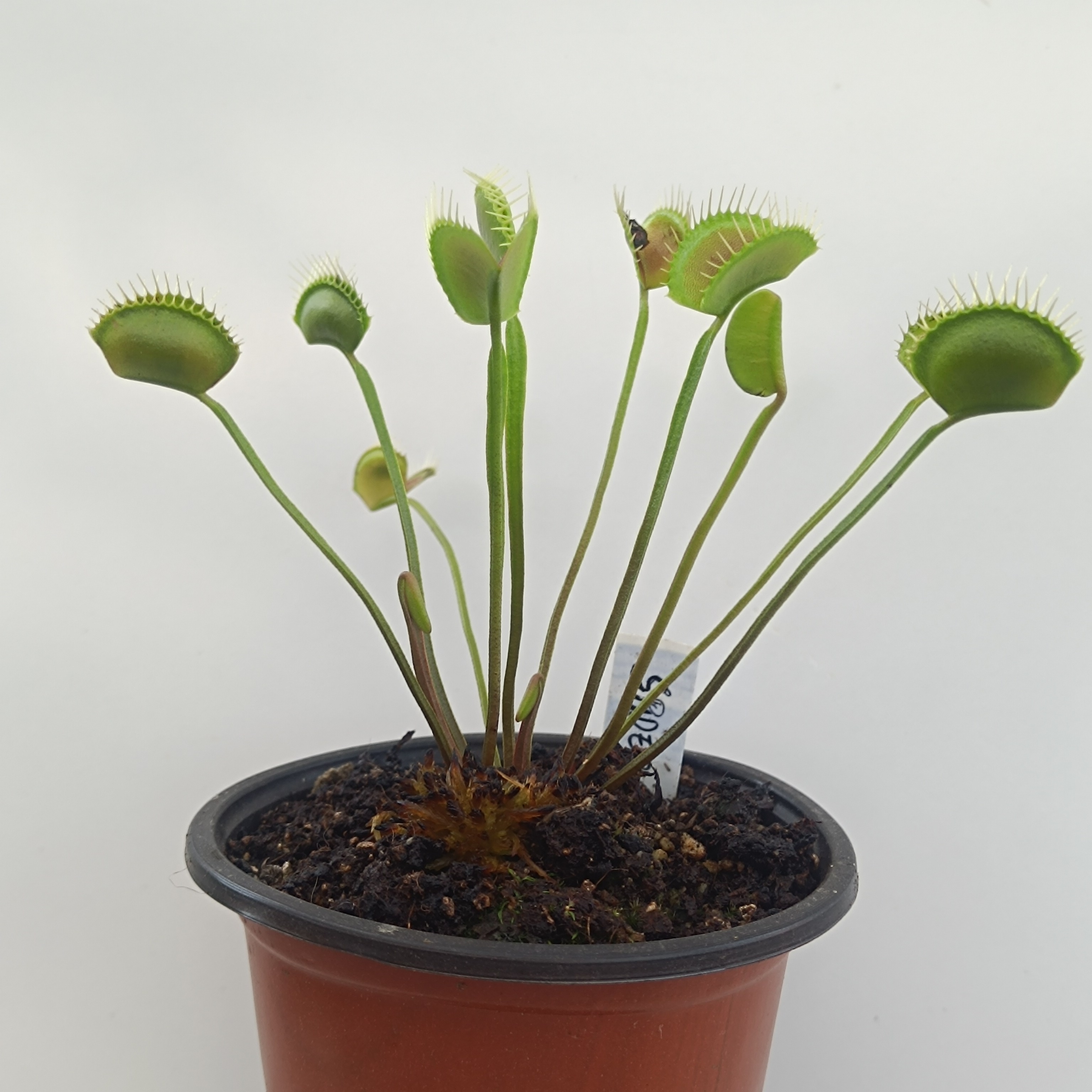 Dionaea muscipula Spider is a clone famous for it's long spindly petioles that resemble spider legs. The leaves are always upright, even on very young plants. the traps are of average size. Plant is green with a reddish hue on the bottom of the petioles and inside of the traps.