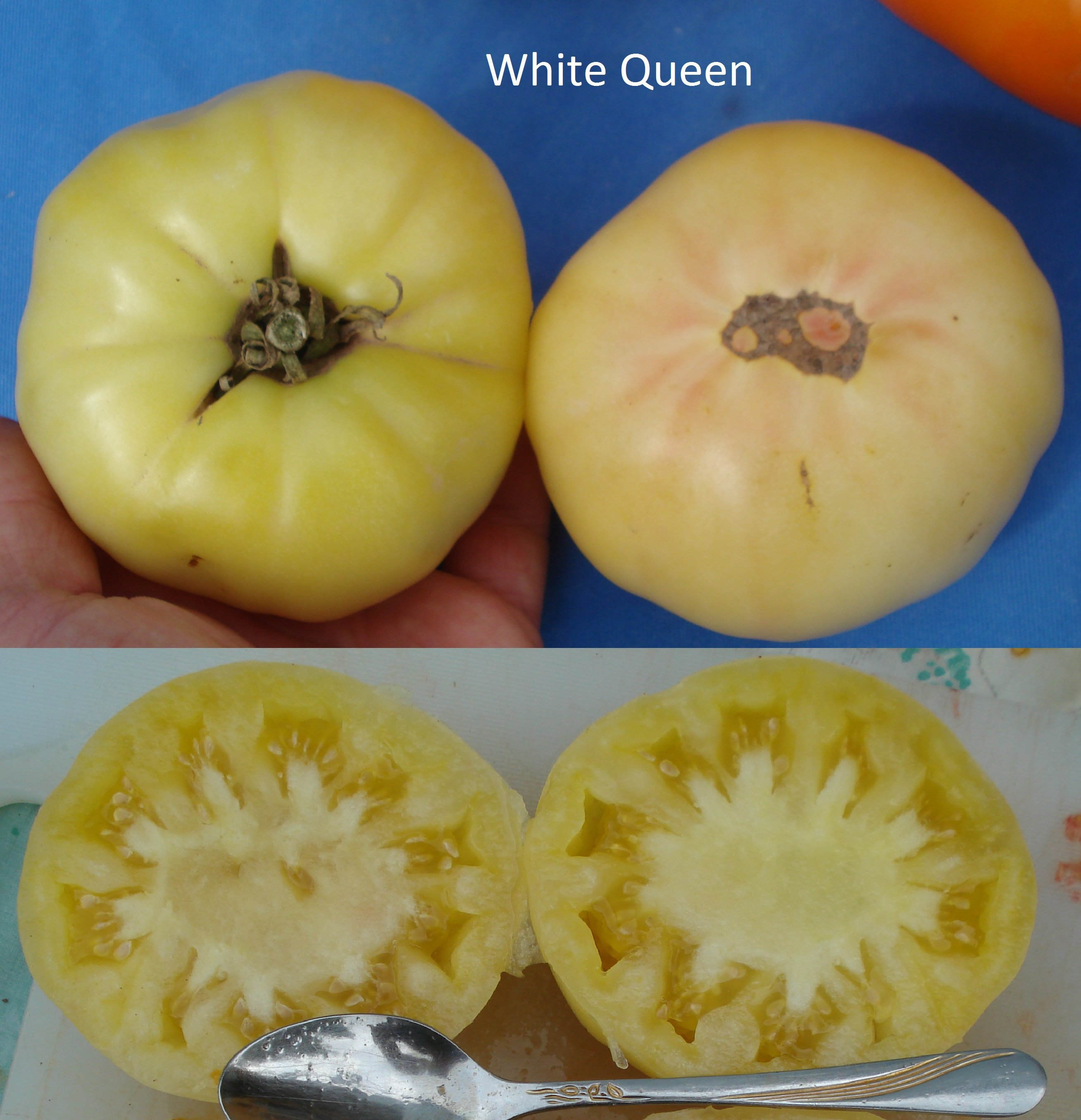 An American heirloom beefstake. Delicious. Probably the whitest of the white colored tomatos. Recognisable from similar varieties by a pinkish hue on the bottom and truly the whitest color.