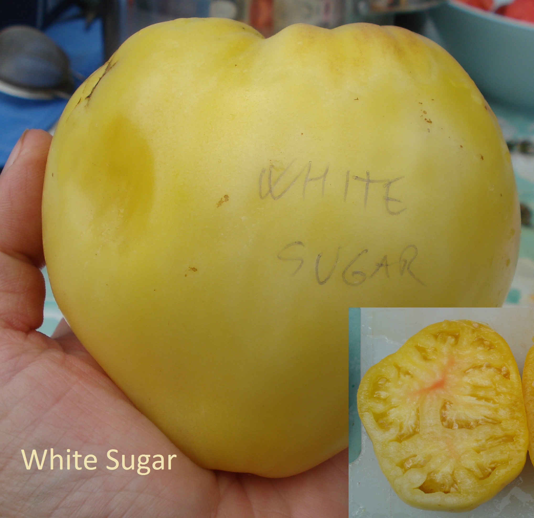 Huge white thing, incredibly sweet. A Russian heirloom variety. Awesome for salads, but also for cooking.