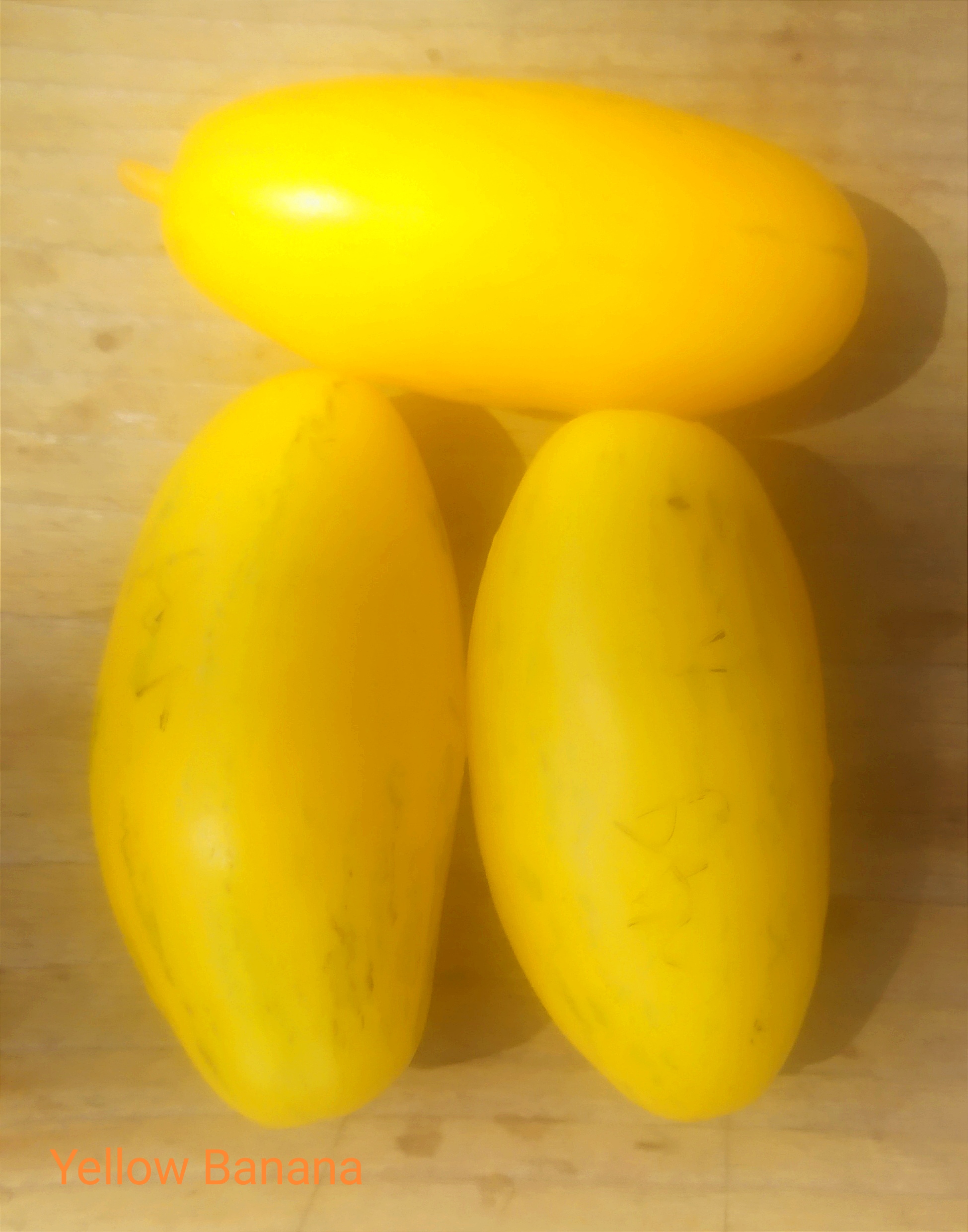 Sausage shaped, yellow with paler streaks. About the same size as Cream Bell Sausage, putting them on the shorter end of sausage tomatos. As all of them, excellent for slicing into tomato rings for your amazing culinary creations.